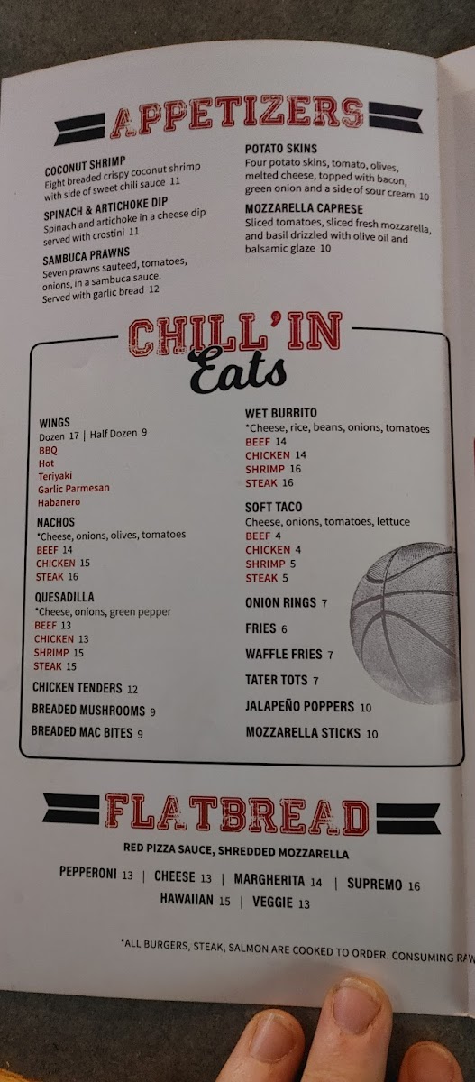 Additional menu highlights include specialty flatbreads such as Hawaiian, Margherita, and Supremo, as well as classic salads like the Chicken Caesar and Chill'in Chopped Salad. Appetizers extend to seafood choices including Sambuca shrimp and coconut shrimp.