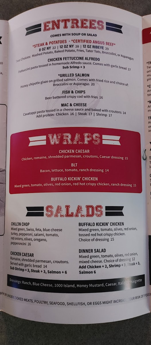 Wraps and sandwiches feature choices like Chicken Caesar, BLT, Buffalo Kickin' Chicken wraps, the Clubhouse sandwich, and the Smokey BBQ Pulled Pork Sandwich. These options provide convenient, handheld meals suitable for a quick lunch or casual dinner.